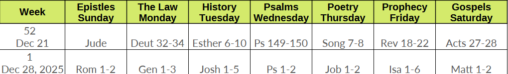 Now is a great time to start or continue the habit of reading your Bible on a daily basis. The link below will take you to the 3 plans Journey has chosen, if you don't already have a plan. Also included is instructions to use the S.O.A.P Bible reading method. Here is the scriptures to be read for the One Year Plan.